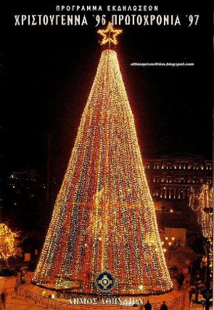 1995, δήμαρχος Δημήτρης Αβραμόπουλος: Η Αθήνα ζει μέρες ευρωπαϊκής λάμψης και πρωτοφανούς χλιδής Για πρώτη φορά ο ερχομός του χρόνου γιορτάζεται στο Σύνταγμα κάτω από το δέντρο, ή ορθότερα από μια τεράστια σιδερένια κατασκευή διάσπαρτη με φωτάκια, ύψους 31,5 μέτρων. 50.000 λαμπάκια τύλιγαν τον τεράστιο σιδερένιο δοκό , που το πρωί ήταν σχεδόν αόρατος.... Το δέντρο μπήκε μάλιστα στο βιβλίο Γκίνες.