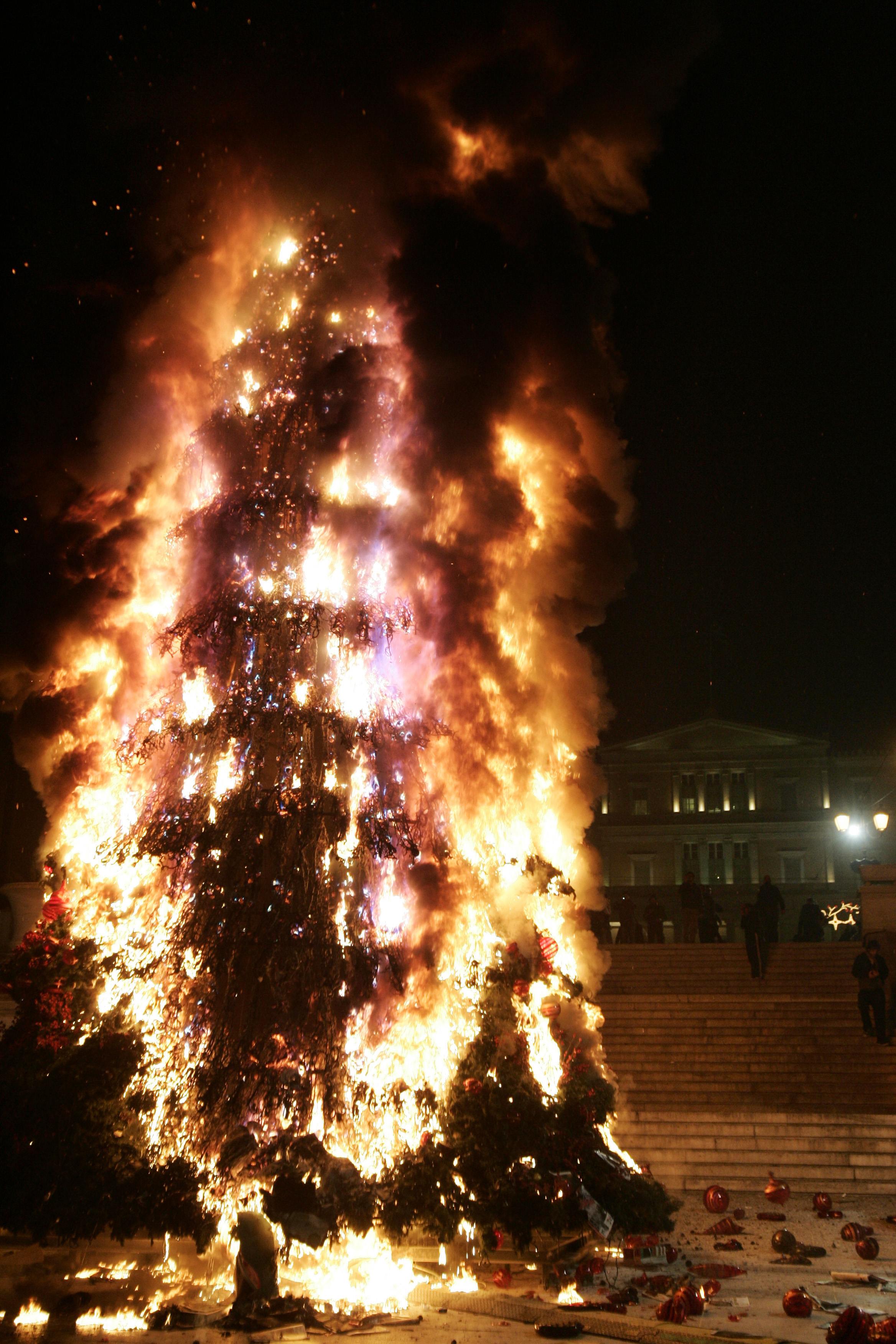 2008, το δέντρο πρωτοσέλιδο στις φλόγες: Η Αθήνα βράζει, οργή και αγανάκτιση λίγες μέρες μετά το θάνατο το Αλεξη Γρηγορόπουλου. Εκταταμένες ζημιές προκαλούνται στην πόλη και το Χριστουγεννιάτικο φωτισμένο δέντρο που έμοιαζε σαν παραφωνία αυτές τις μέρες οργής και θλίψης παραδίδεται στις φλόγες. Η εικόνα κάνει το γύρο του κόσμου, γίνεται ακόμα και πρωτοσέλιδο στους New York Times. Η Αθήνα θρηνεί και γυρίζει την πλάτη στα Χριστούγεννα.