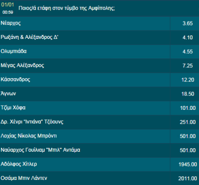 Φυσικά, οι απίθανες αυτές επιλογές δίνονται σε μεγάλες αποδόσεις, ενώ αντίθετα «φαβορί» χρίζεται ο Νέαρχος, και τον ακολουθούν η Ρωξάνη και ο Αλέξανδρος Δ', και κατόπιν η Ολυμπιάδα, ο Μέγας Αλέξανδρος και ο Κάσσανδρος.