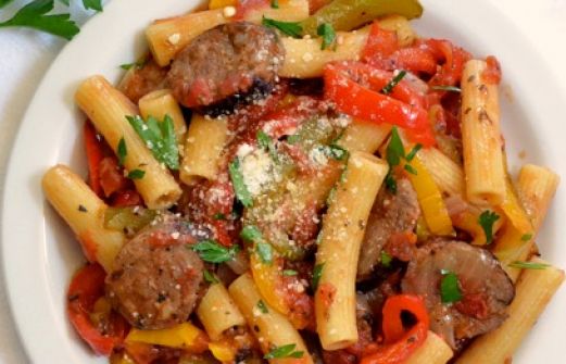 Βράζετε τα μακαρόνια και τα στραγγίζετε. Σε ένα φαρδύ τηγάνι ζεσταίνετε το ελαιόλαδο και σοτάρετε τις πιπεριές μέχρι να ροδίσουν μαζί με .....